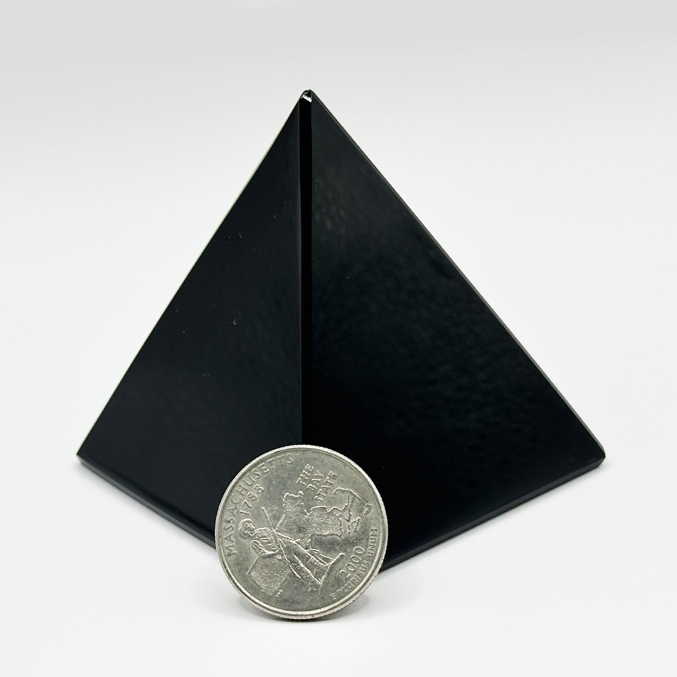 Add a bold and modern touch to your space with this handcrafted Black Obsidian Pyramid. Measuring 2.5 inches tall and 2.4 inches wide, and weighing approximately 7 ounces, this compact yet substantial piece is made from natural black obsidian stone and polished to a smooth, glossy finish. Its clean lines and solid construction make it an eye-catching addition to any home or office décor.