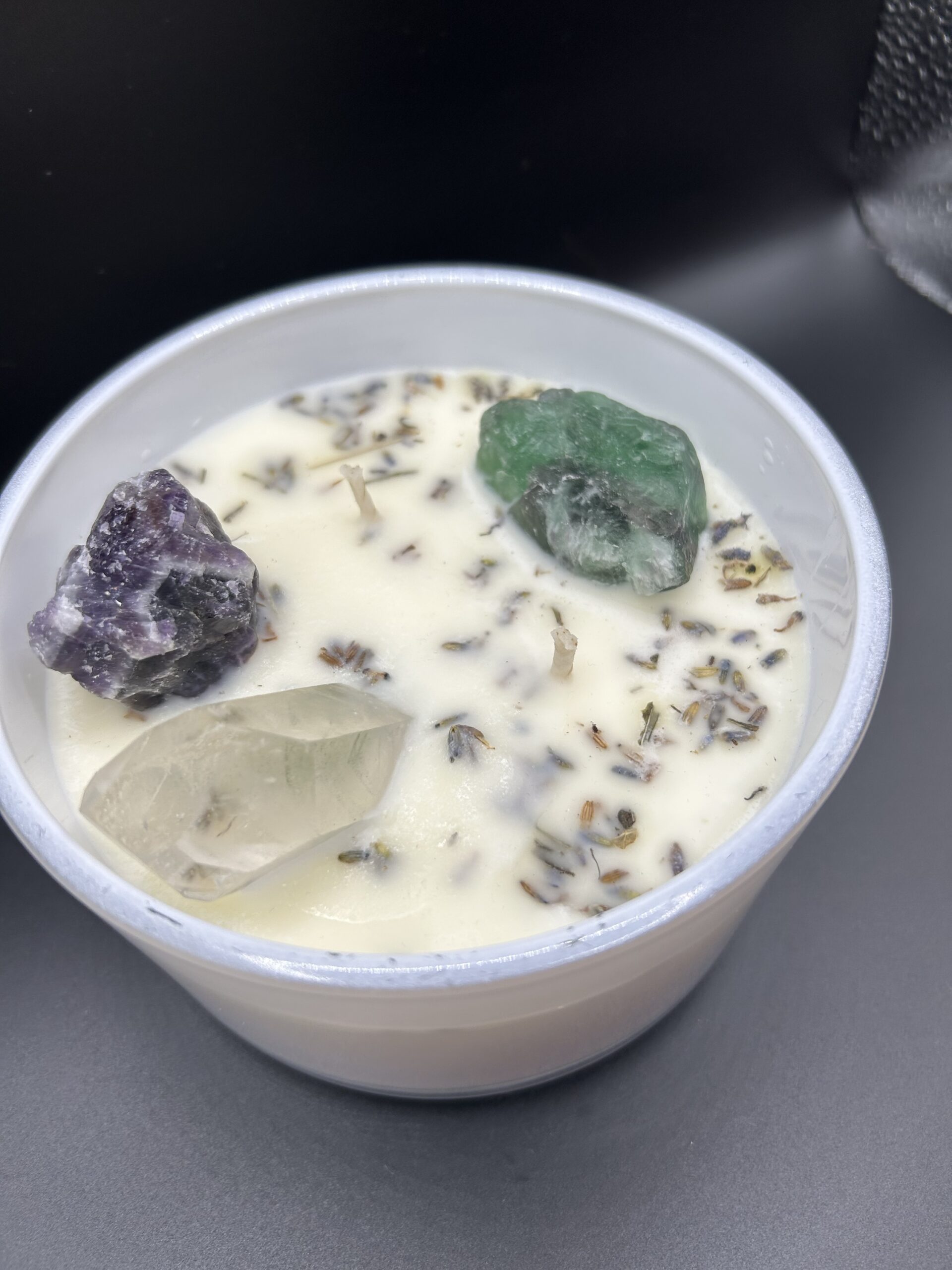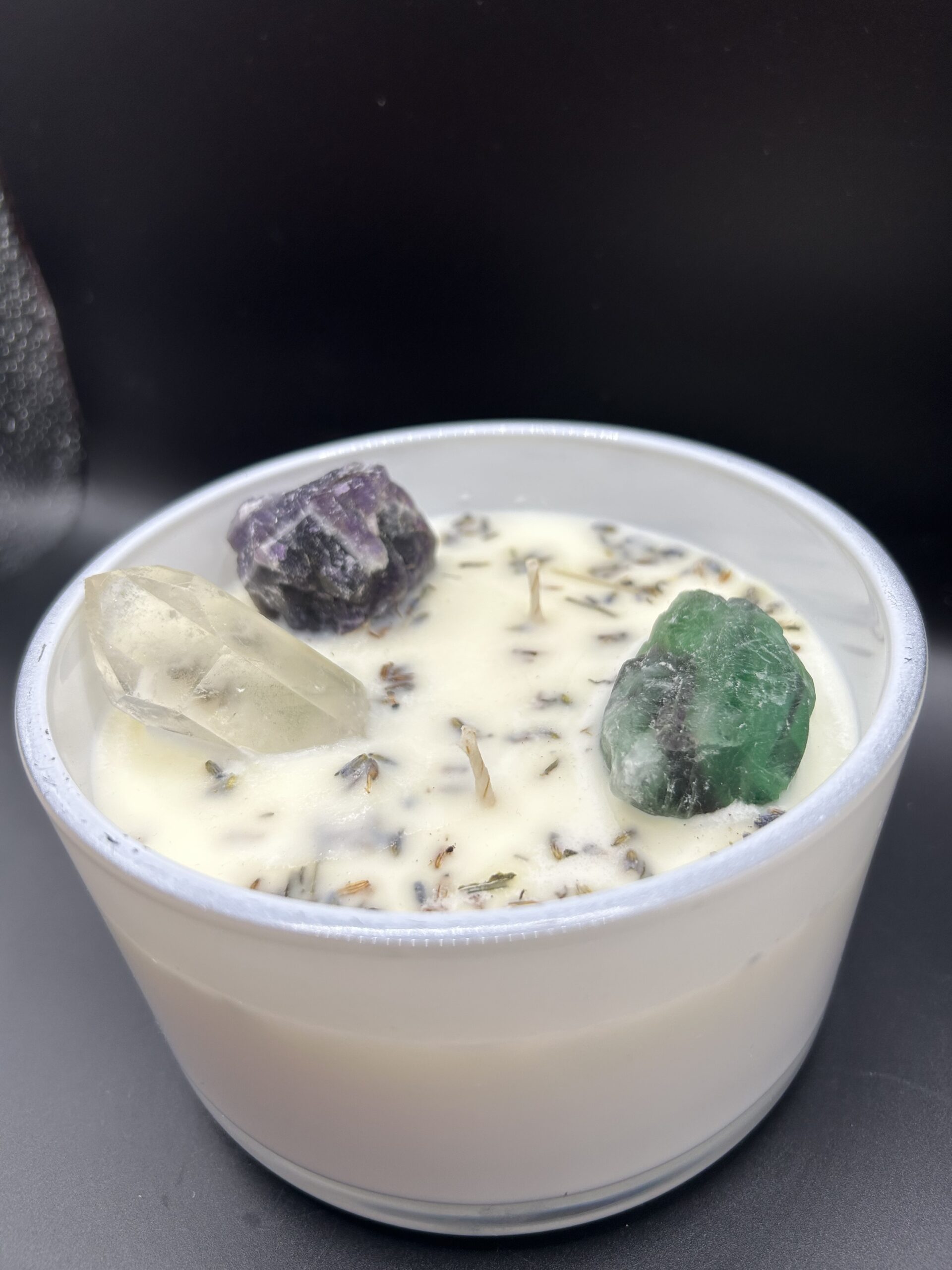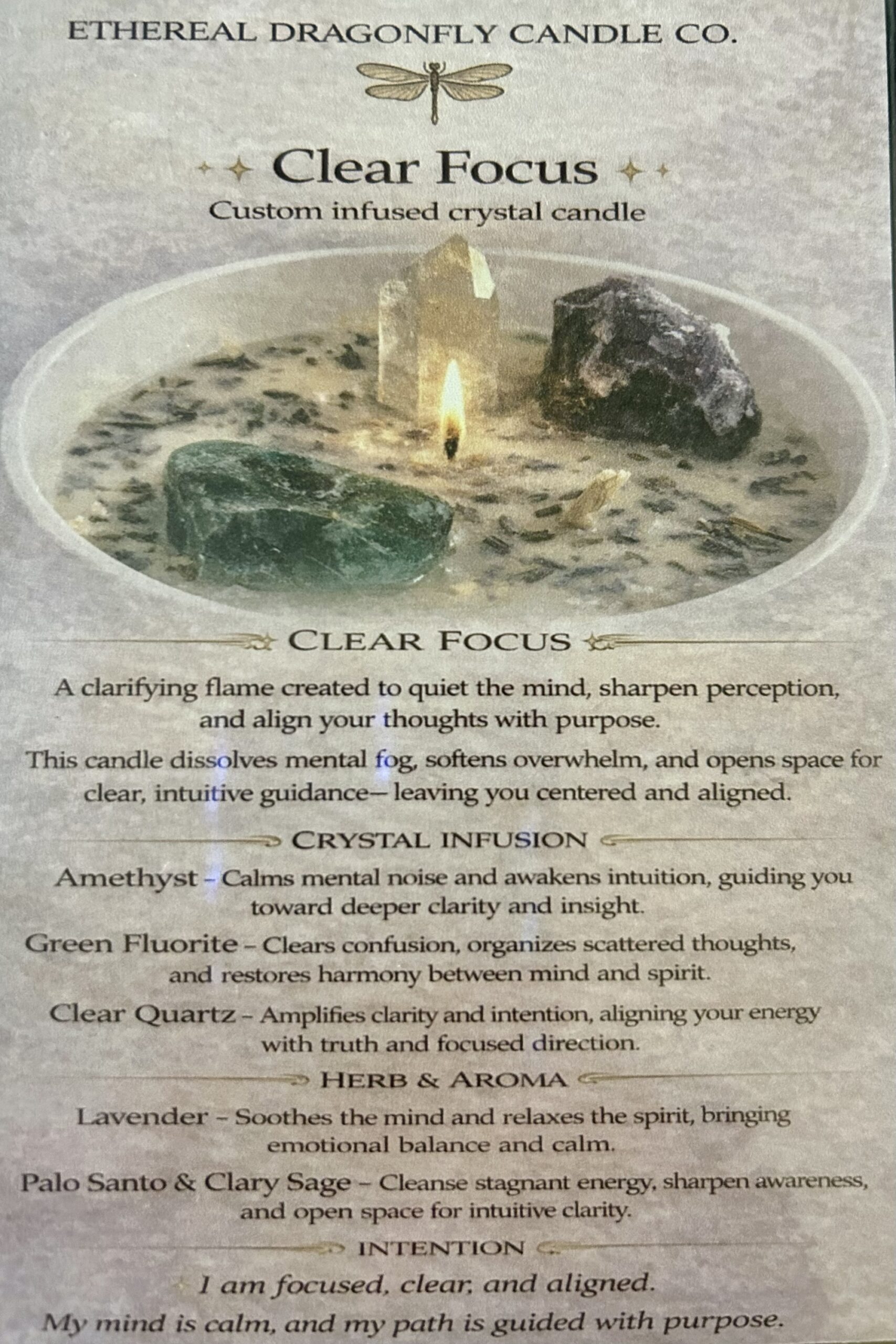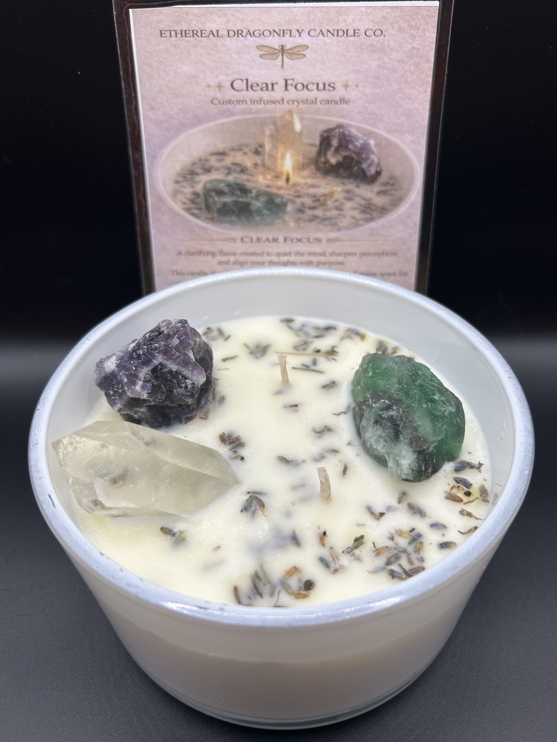 Clear Focus by Ethereal Dragonfly Candle Co. is a custom infused crystal candle—a clarifying flame created to quiet the mind, sharpen perception, and align your thoughts with purpose. This candle dissolves mental fog, softens overwhelm, and opens space for clear, intuitive guidance, leaving you centered and aligned.