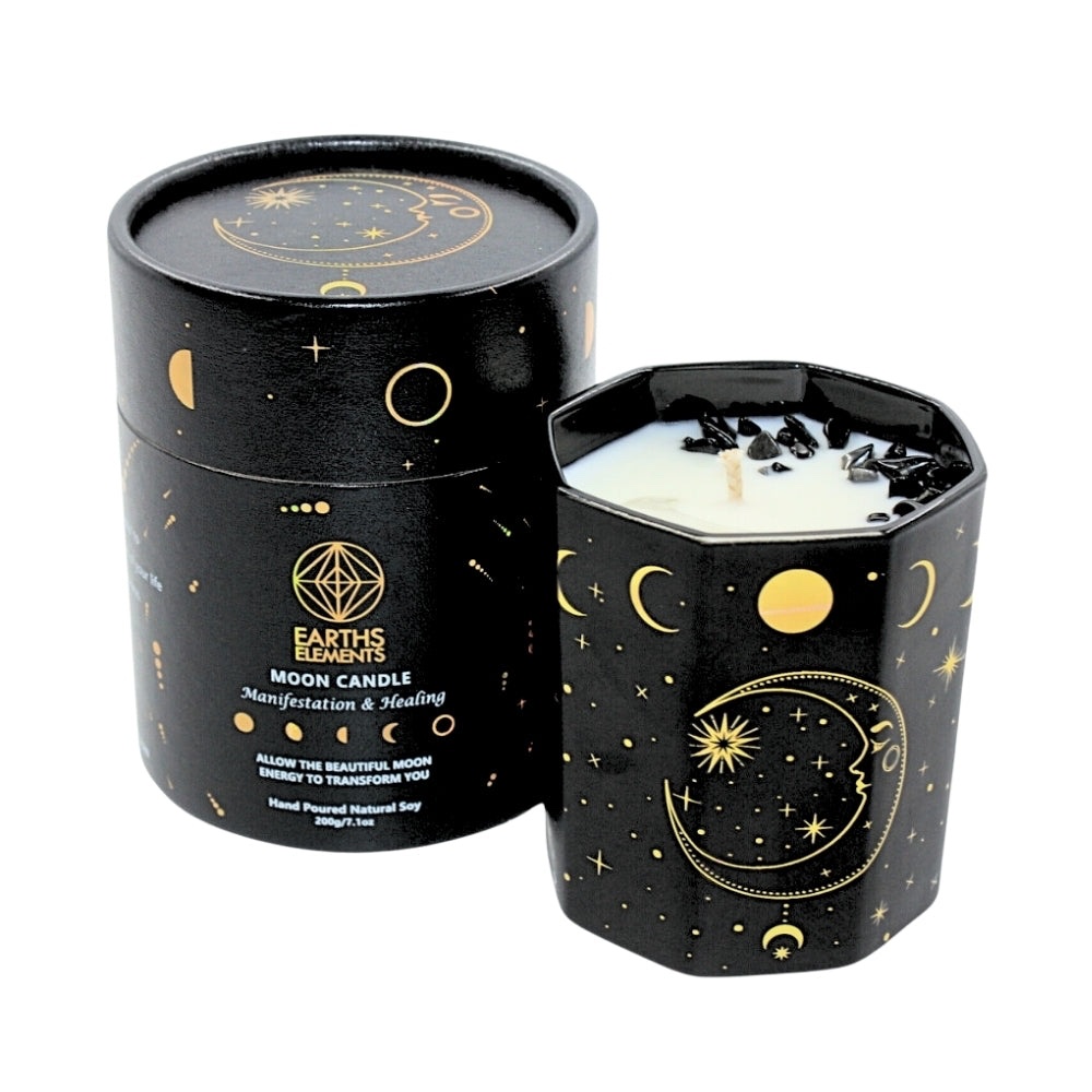 Harness lunar cycles for manifestation with the Crystal Candle, Moon Phase – Pack of 6, hand-poured natural soy votives infused with black obsidian for protection and clear quartz moonstones for energy amplification—each 7.1oz candle burns 40 hours with organic Tequila scent. Perfect for new or full moon rituals, these align intentions with cosmic flow, shielding negativity while clarifying goals for abundance.
