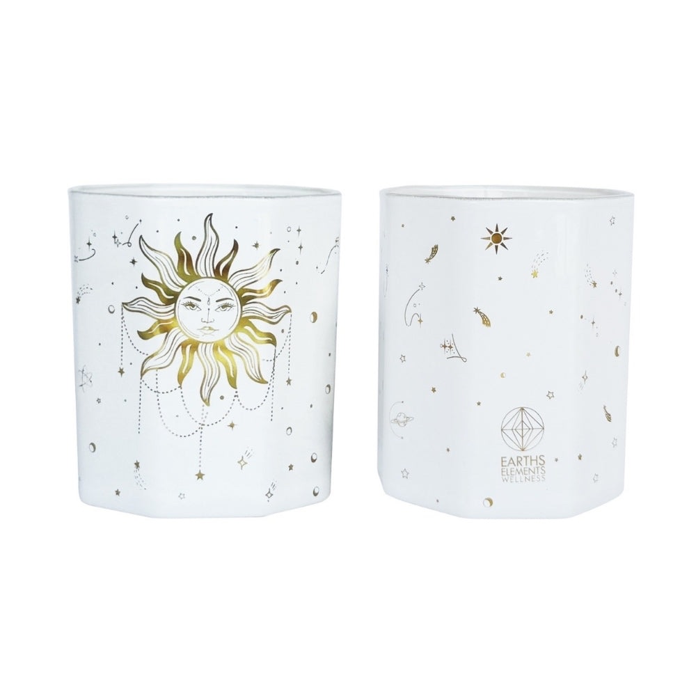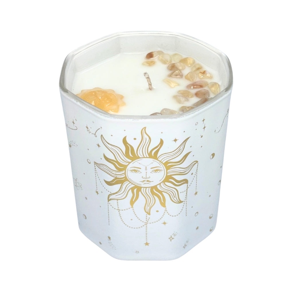 Radiate solar vitality with the Crystal Candle, Sun—a hand-poured soy wax candle infused with radiant citrine and sunstone chips for confidence, abundance, and personal power, evoking the sun’s transformative fire. This golden-hued votive burns for 40 hours with uplifting citrus-vanilla notes, aligning solar plexus chakra energy to dispel shadows, ignite creativity, and attract prosperity during success rituals or daily affirmations.