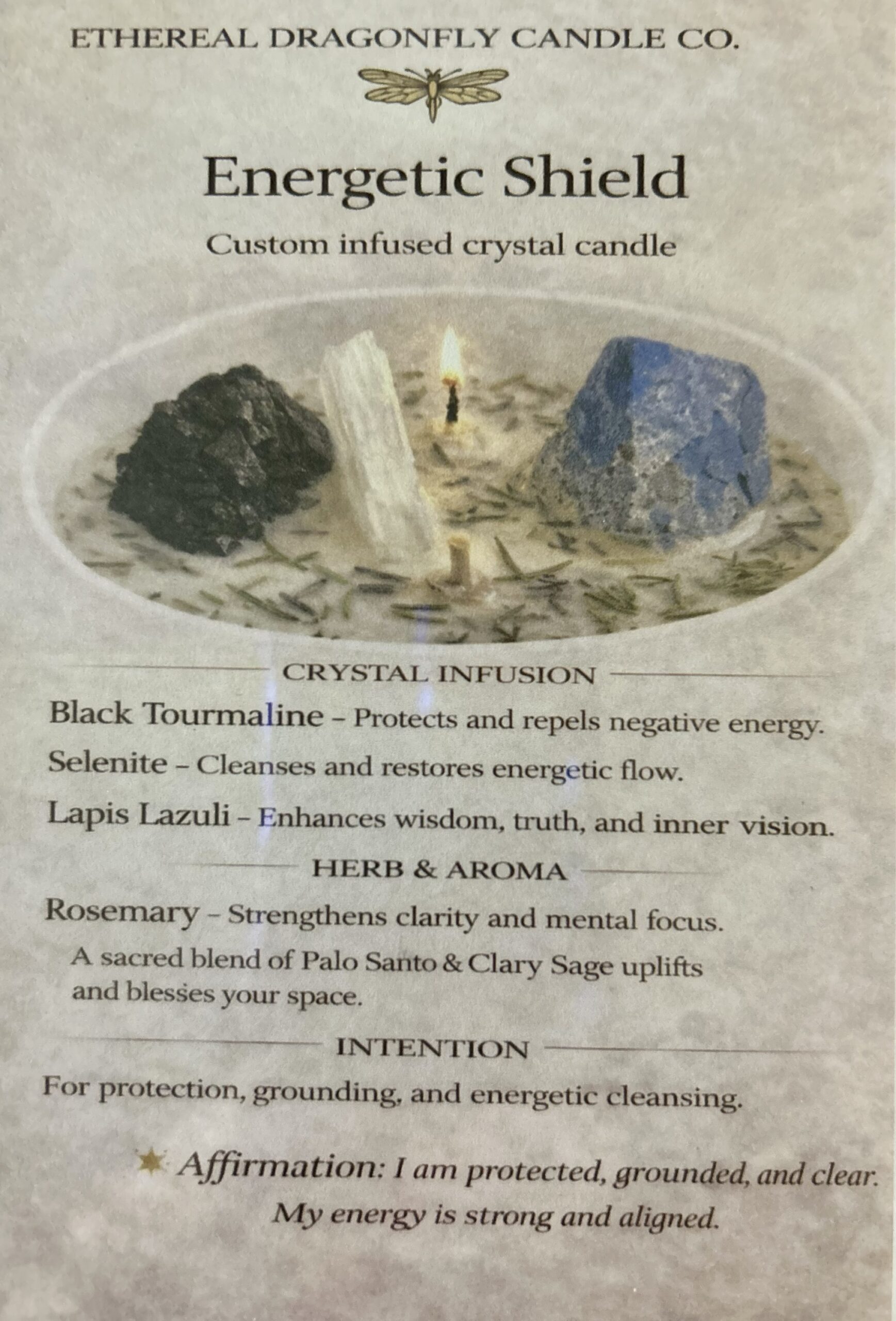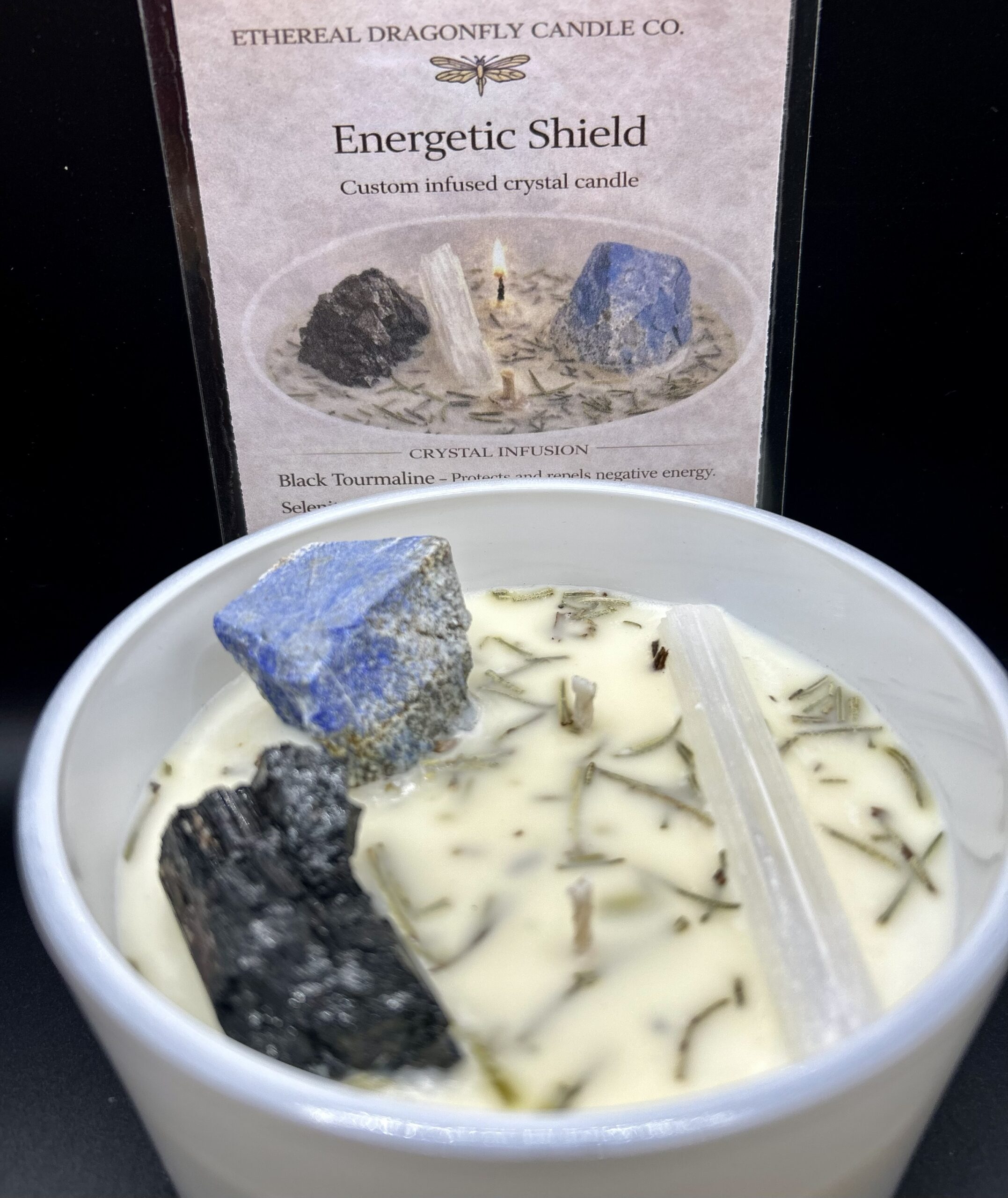 Energetic Shield by Ethereal Dragonfly Candle Co. is a custom infused crystal candle created for protection, grounding, and energetic cleansing. This thoughtfully crafted blend supports a strong, clear, and balanced energy field while helping you feel spiritually centered and shielded.