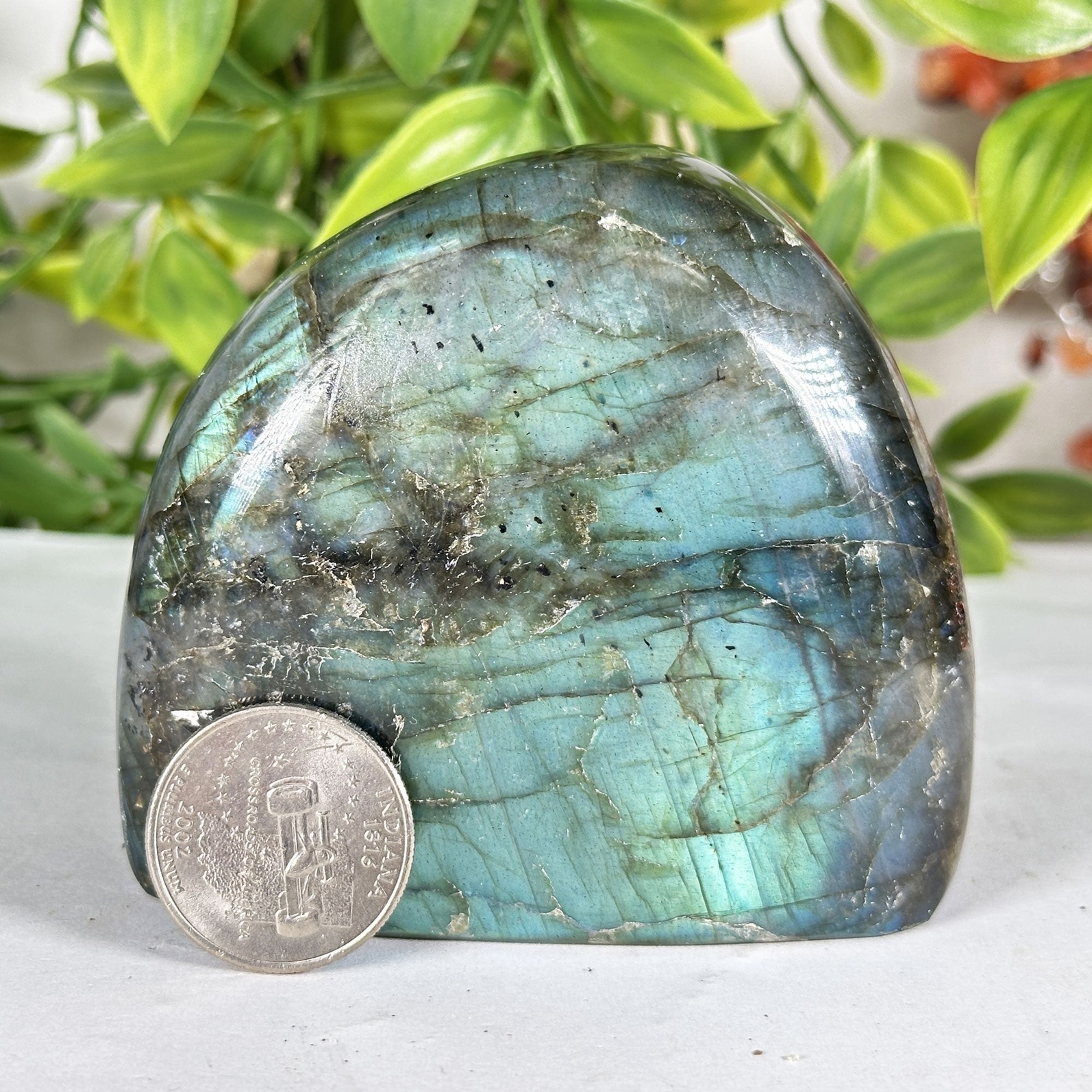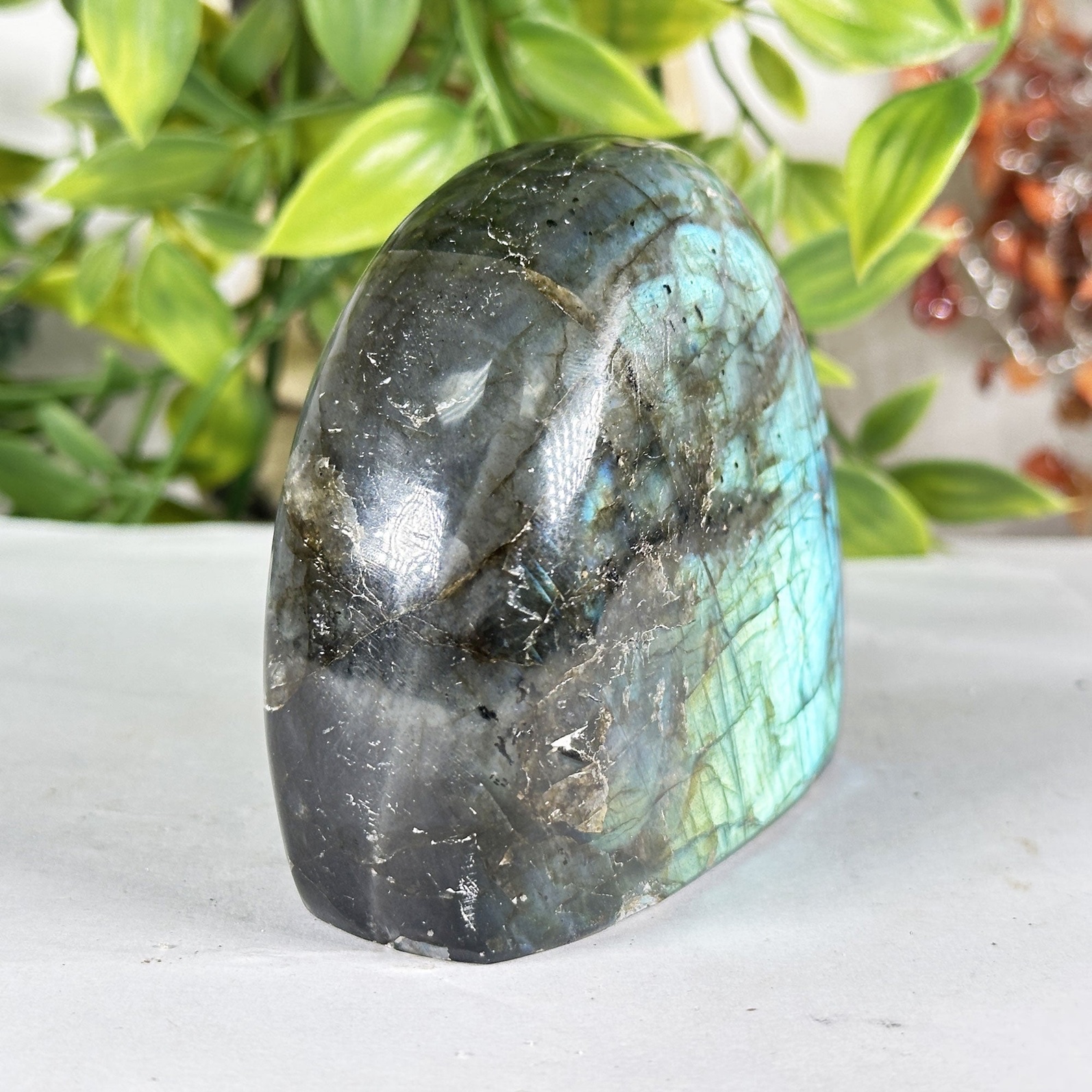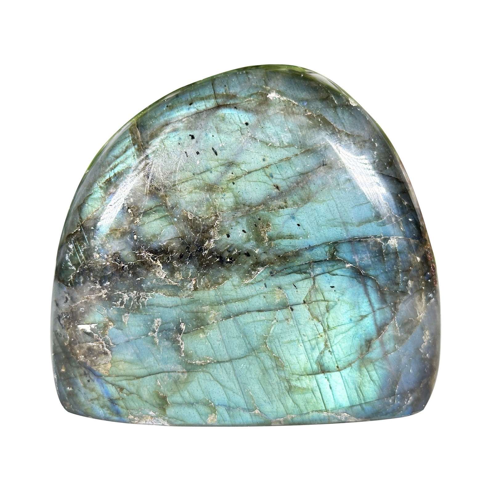 A polished Labradorite freeform stone from Madagascar with vibrant green and blue flash measuring about 2.75 inches in length and weighing 0.94 pounds. Its natural flash makes it a striking accent for jewelry or decor offering a calming energy and unique visual appeal for collectors and creators.