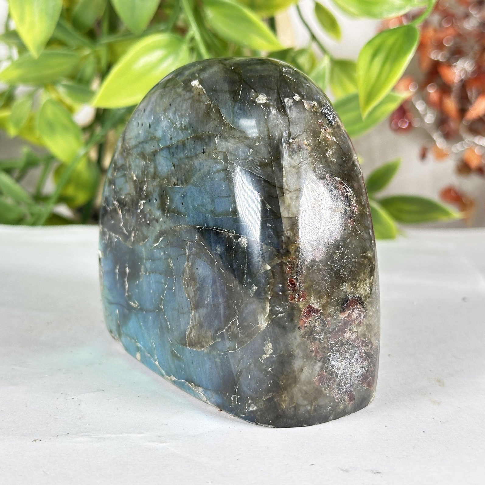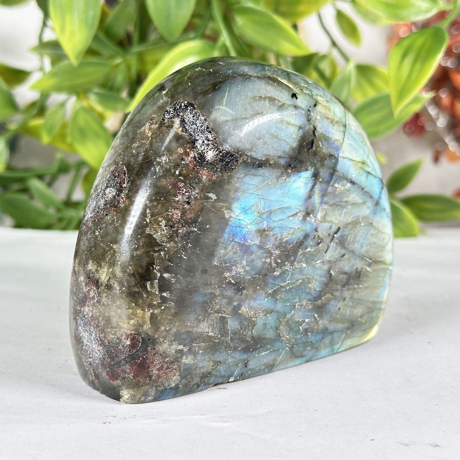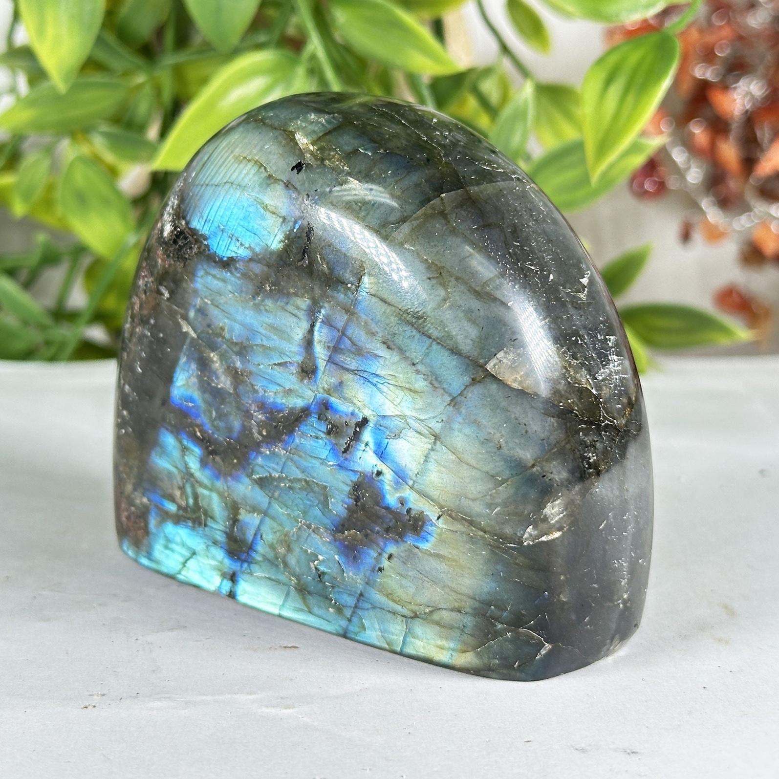 A polished Labradorite freeform stone from Madagascar with vibrant green and blue flash measuring about 2.75 inches in length and weighing 0.94 pounds. Its natural flash makes it a striking accent for jewelry or decor offering a calming energy and unique visual appeal for collectors and creators.