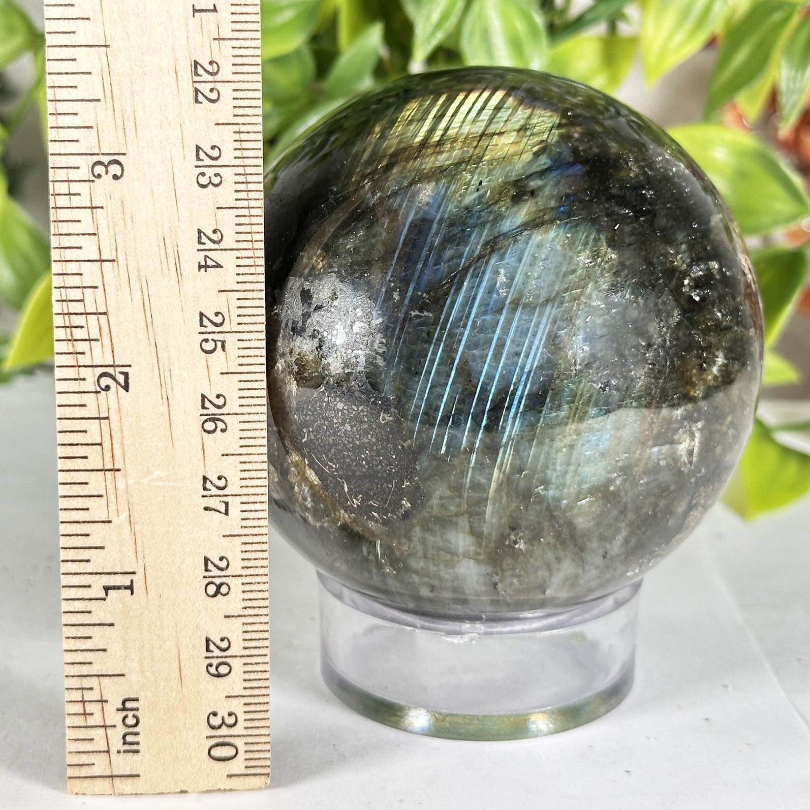 Polished Labradorite Crystal Sphere with Blue Flash Weight 1.31 Lb Approximately Diameter 2.5 inches. The sphere features a smooth polished surface and iridescent flashes of blue that shift with light. It is made from natural Labradorite stone and feels solid in the hand.