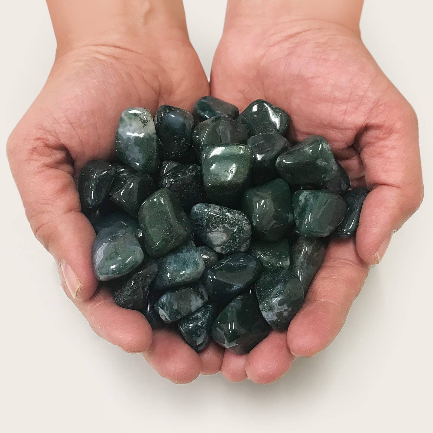 Natural Moss Agate Tumbled Stone Gemstones are earthy green “growth crystals” that bring calm, abundance, and connection to nature. Each smooth tumbled stone reveals delicate moss‑like patterns in translucent white or clear agate, making them perfect for gardens, altars, or carrying as gentle pocket peace stones.