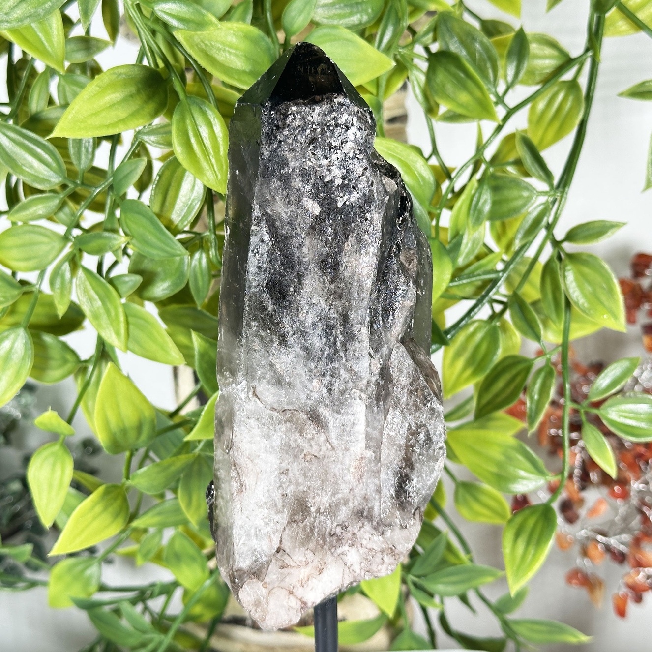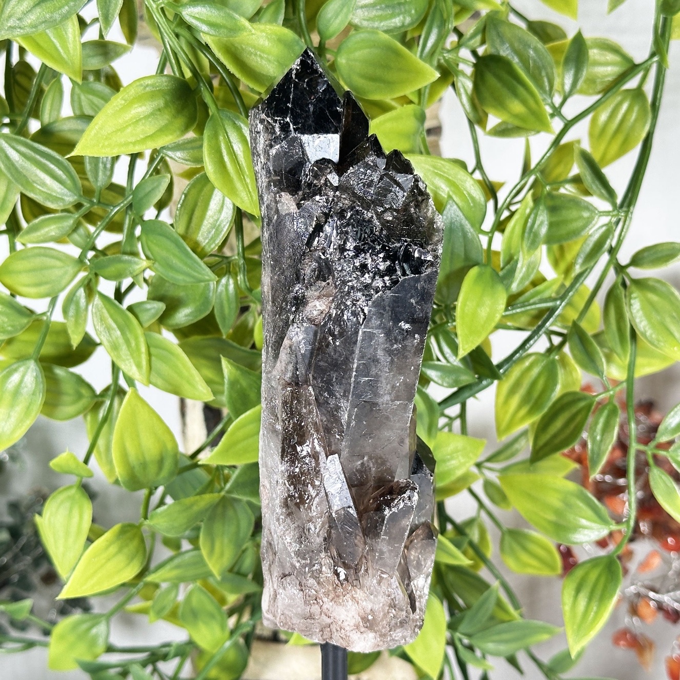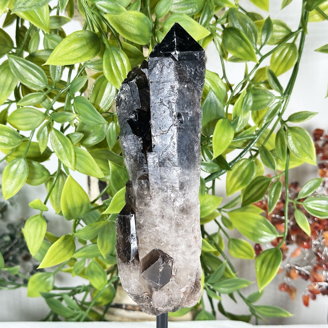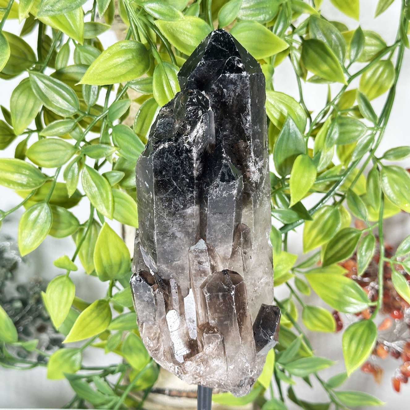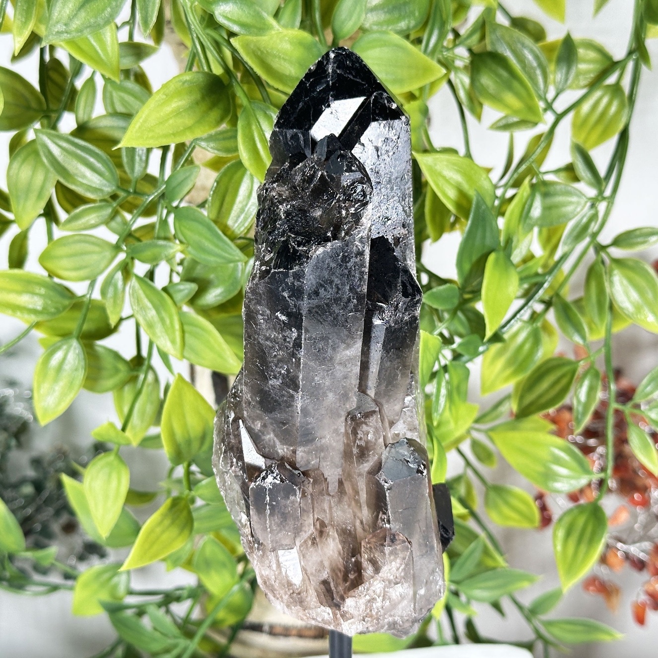 Natural Smoky Quartz Crystal Tower on Stand features a polished smoky quartz point carefully mounted on a base, turning it into a striking display specimen and functional healing stone. Smoky quartz is known as one of the strongest grounding and protective crystals, helping to absorb and transmute negative energy, release stress, and anchor scattered emotions back into the present.