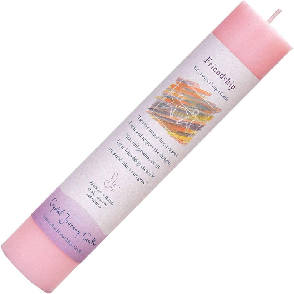Foster deep bonds and harmonious relationships with Crystal Journey’s Friendship Intention Candle, a soft pink pillar candle infused with rose quartz crystals, rose petals, and heart-opening essential oils like rose, geranium, and vanilla. This 2×3 inch soy-paraffin blend burns for 40+ hours, releasing a sweet, comforting scent that attracts loyal friends, strengthens platonic love, and promotes mutual respect. The heartfelt mantra affirms: “Teach me to love and respect friendship as a treasured gift.” Ideal for mending friendships, group rituals, or self-love practices—pair with rhodonite, pink tourmaline, or honey calcite to amplify connection and joy.