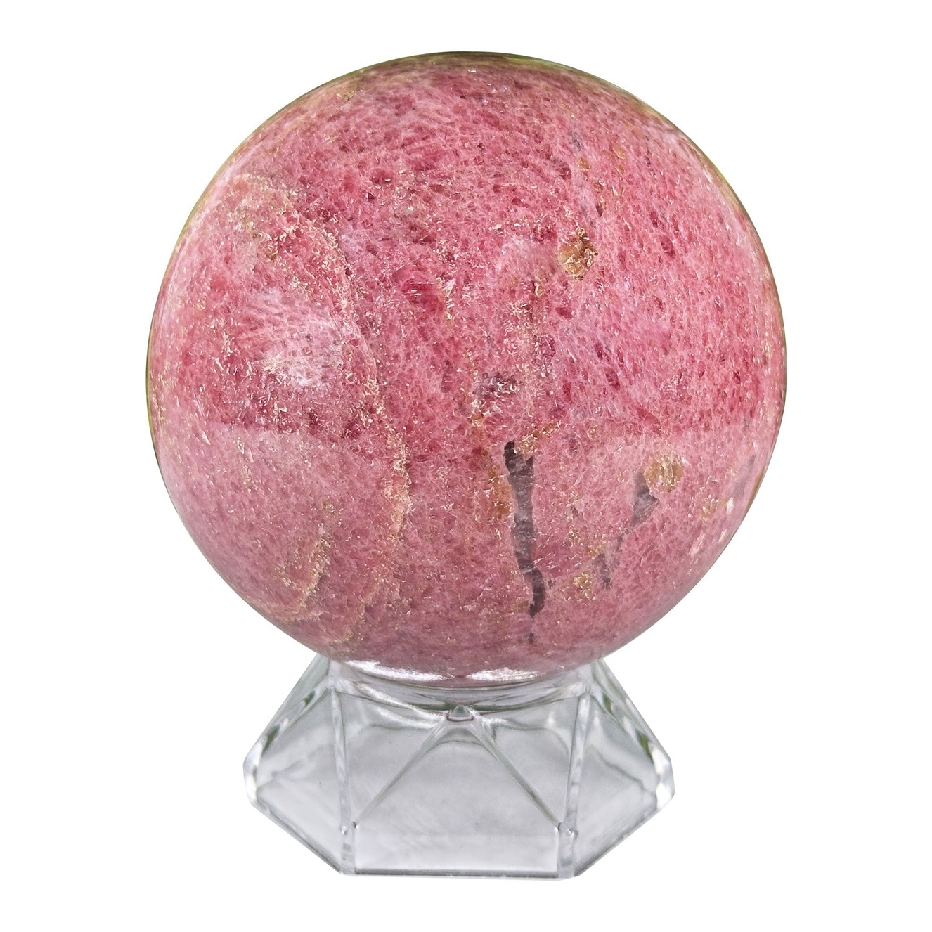 Rhodonite Gemstone Sphere is a hand‑polished ball of rhodonite, a manganese silicate stone that ranges from pale rose to deep pink with striking black manganese‑oxide veins. Often called the “Stone of Love,” rhodonite works strongly with the heart chakra, clearing old emotional patterns, softening defensiveness, and encouraging compassion for both self and others.