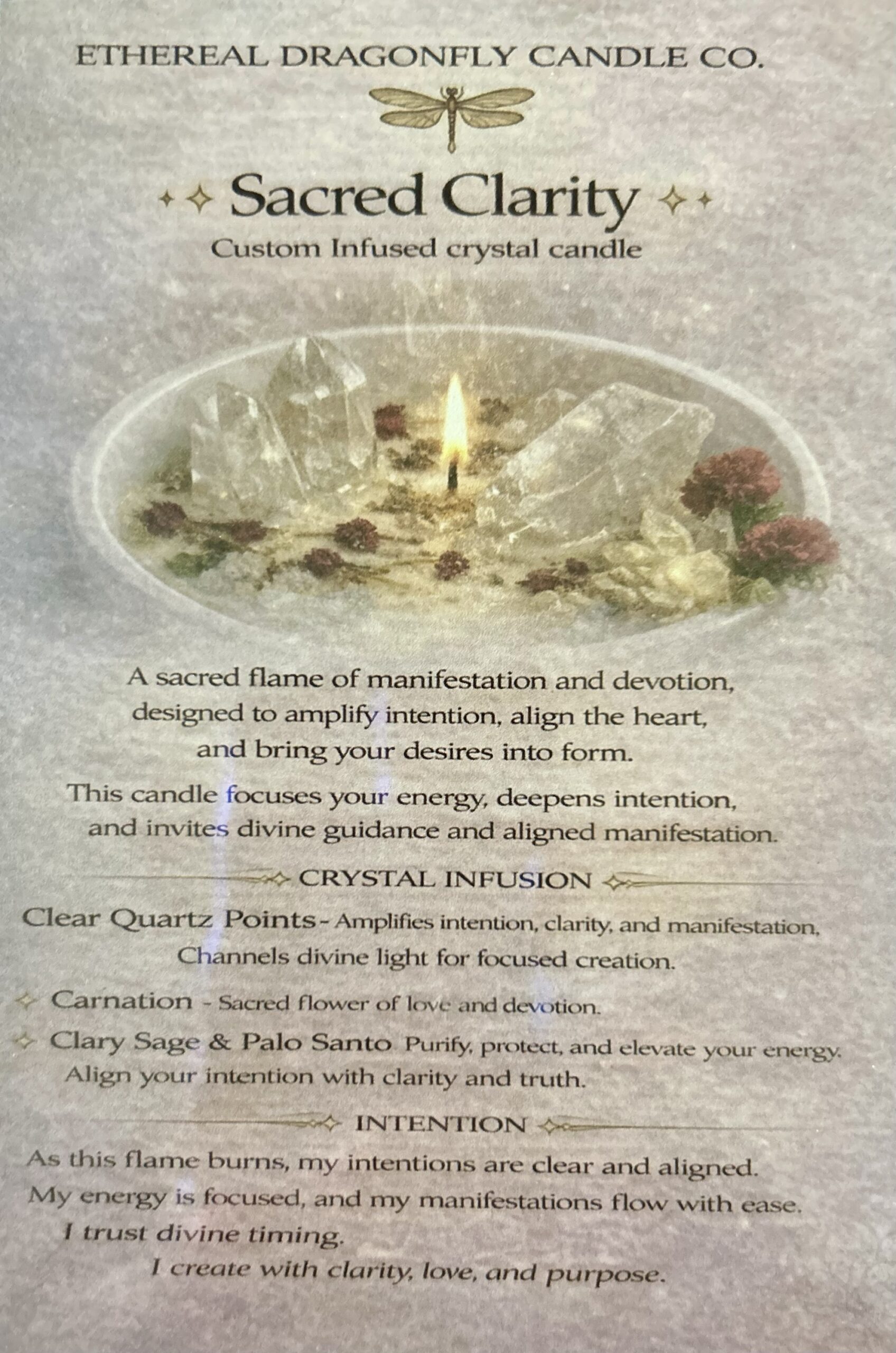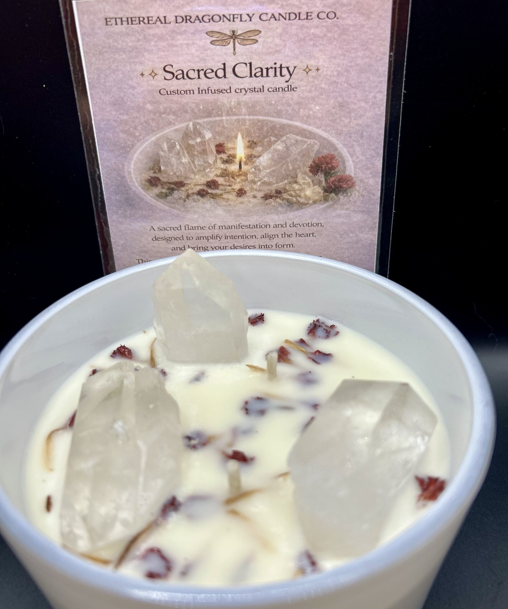 Sacred Clarity is a custom infused crystal candle—a sacred flame of manifestation and devotion designed to amplify intention, align the heart, and bring your desires into form. This candle focuses your energy, deepens intention, and invites divine guidance for clear, purposeful creation.