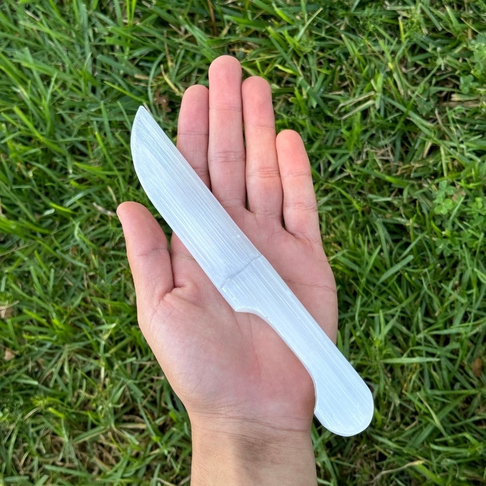 Purify your sacred space with the Selenite Knife, Small—a delicate, hand-carved wand of translucent selenite crystal perfect for precise energy clearing and crystal charging. Known as a master cleanser, selenite instantly removes negative attachments, cuts energetic cords, and opens crown/third eye chakras for higher awareness without needing cleansing itself. Ideal for aura sweeping, altar maintenance, or meditation focus.